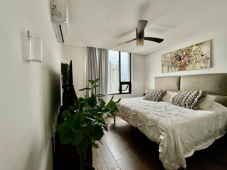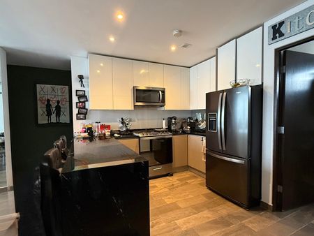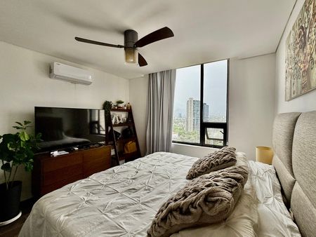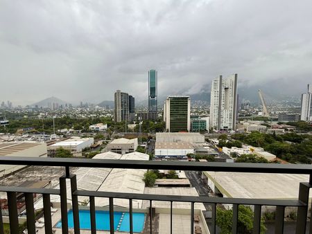 Ubicado en el piso 11, con una superficie de 113.32 m2, cuenta con 2 recámaras, 2 baños completos, medio baño, sala, comedor, cocina equipada, lavandería, balcón con vistas hacia la Sierra Madre, bodega y 2 cajones de estacionamiento. Equipado con 3 minisplits.
